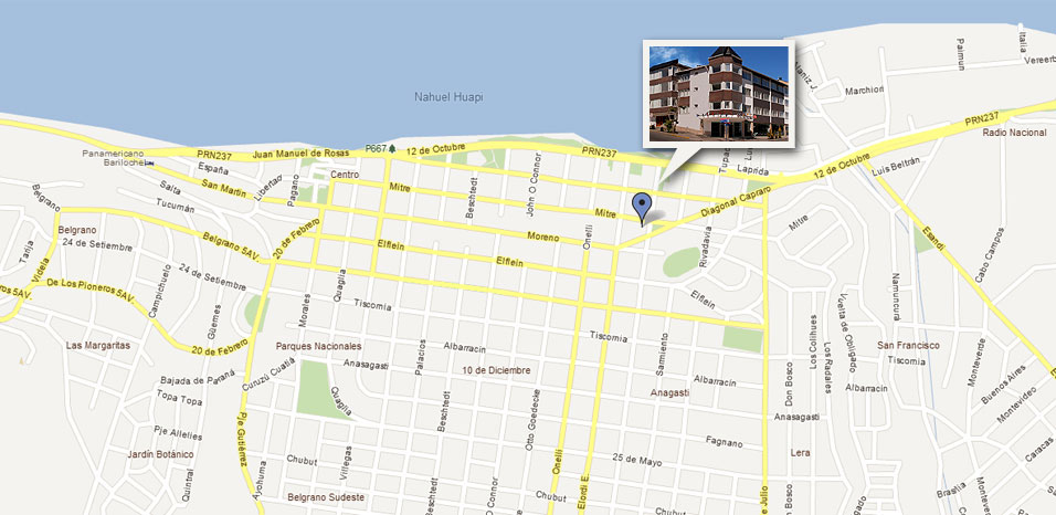 El Hotel se encuentra ubicado en la calle Mitre 1097 (esquina Ruiz Moreno) a pocos metros del centro comercial de la Ciudad de Bariloche.